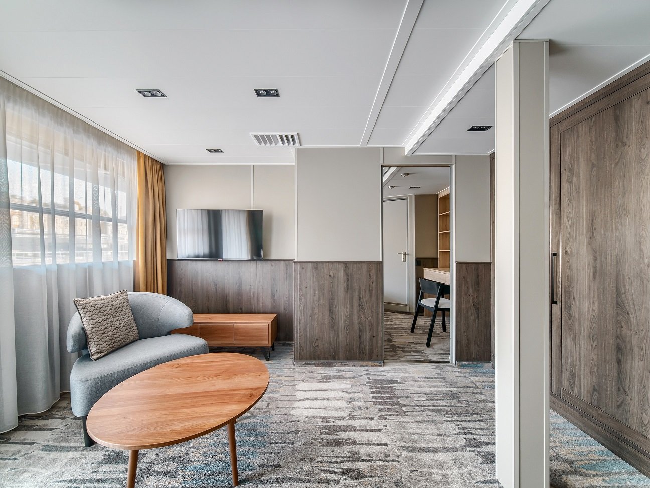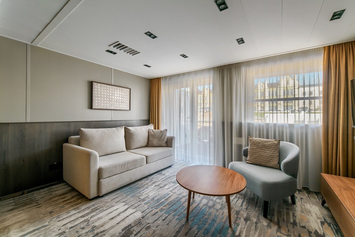 Комфортабельная гостиная с современным интерьером. Удобства: диван (раскладывается), кресло, журнальный столик, холодильник, телевизор, тумба, шкаф для одежды, прикроватные тумбы, 4 розетки на 220V, две розетки USB, фен. Балкон: два кресла, кофейный столик, два шезлонга. В спальне: двуспальная кровать (кровати раздвигаются), письменный стол, книжный стеллаж. В каюте возможно 4-местное размещение. Размер кровати —175х210 см. Размер дивана — 150х185 см.