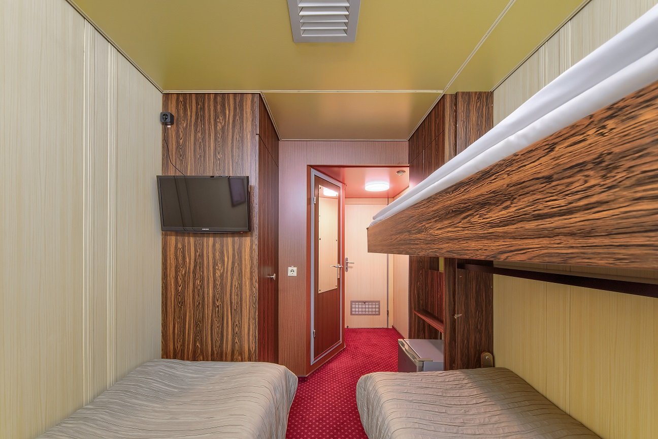 В каюте три спальных места (не сдвигаются), шкаф для одежды, радио, телевизор, холодильник, фен, сейф, кондиционер, душ, санузел, обзорное окно, электророзетка на 220V.