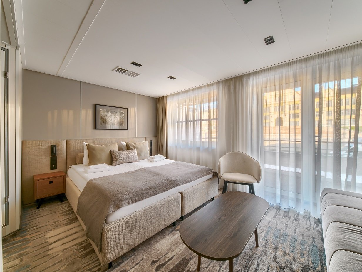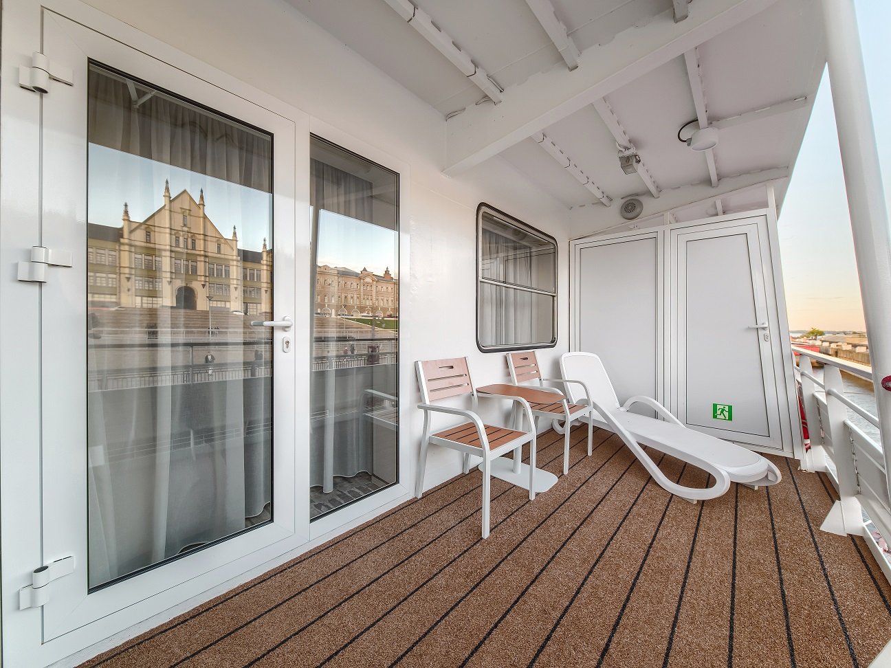 Комфортабельная комната с современным интерьером. Удобства: диван (раскладывается), телевизор, двуспальная кровать (кровати раздвигаются), прикроватные тумбы, письменный стол, холодильник, книжный стеллаж, журнальный столик, пуф, шкаф для одежды, 4 розетки на 220V, две розетки USB, фен. Балкон: два кресла, кофейный столик. Размер кровати — 175х210 см. В каюте возможно 3-местное размещение.