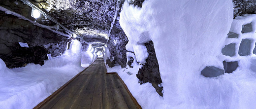 Город, построенный в вечной мерзлоте. Глубина промерзания земли здесь достигает 35 м и участники экспедиции спускаются в Музей вечной мерзлоты, созданный в уникальной подземной пещере учеными. В музее можно увидеть, как выглядят росшие здесь 50 000 лет назад деревья и другие артефакты ушедших эпох, сохраненные подо льдом.