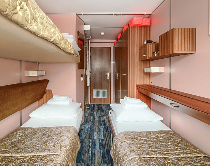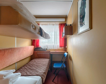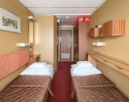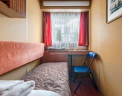 В каюте: одно спальное место, шкаф для одежды, зеркало, радио, душ, санузел, кондиционер, фен, обзорное окно, электророзетка на 220V. Площадь кают от 5,8 кв.м до 6,2 кв.м.