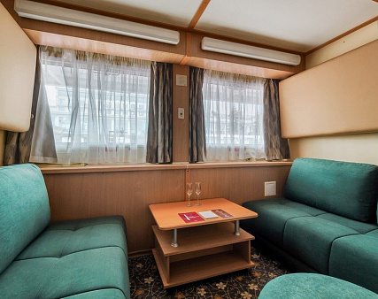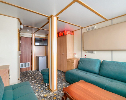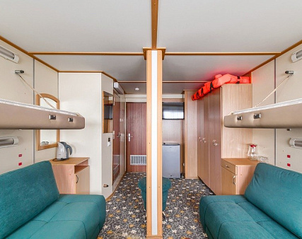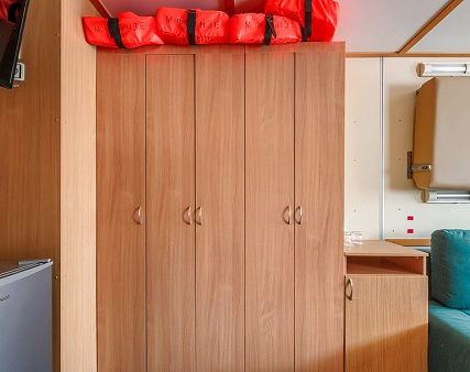 В каюте: два дивана-книжки (раскладываются), два спальных места вторым ярусом, два шкафа для одежды, зеркало, телевизор, холодильник, радио, фен, два обзорных окна, электророзетка на 220V.