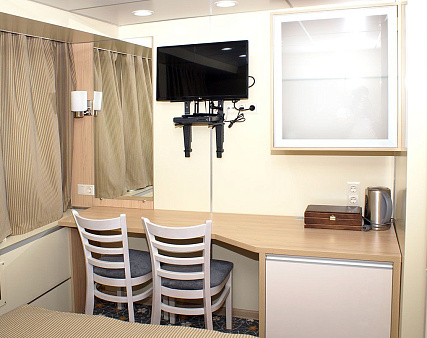 В каюте: двуспальная кровать, одно спальное место вторым ярусом, два шкафа для одежды, зеркало, телевизор, холодильник, радио, фен, два обзорных окна, электророзетка на 220V.