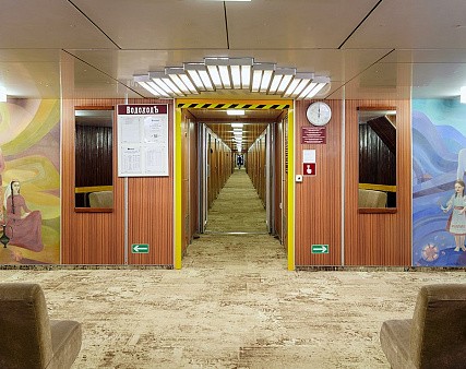 В каюте: два дивана-книжки (раскладываются), два спальных места вторым ярусом, два шкафа для одежды, зеркало, телевизор, холодильник, радио, фен, два обзорных окна, электророзетка на 220V.