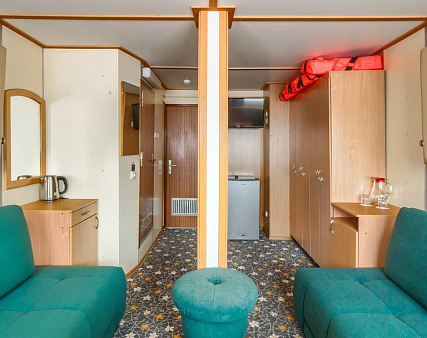 В каюте: два дивана-книжки (раскладываются), два спальных места вторым ярусом, два шкафа для одежды, зеркало, телевизор, холодильник, радио, фен, два обзорных окна, электророзетка на 220V.