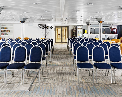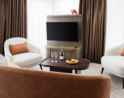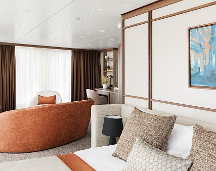В каюте: терраса, двуспальная кровать, прикроватные тумбы, диван и два кресла, журнальный стол, туалетный столик, стул, шкаф, телевизор, холодильник, капсульная кофемашина (1 капсула в день на человека (по количеству гостей в каюте), чайник, радио, телефон, санузел с душем, кондиционер, фен, сейф, электророзетка на 220V.