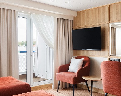 В каюте: балкон, две односпальные кровати (можно сдвинуть), прикроватные тумбы, туалетный столик, стул, шкаф, телевизор, холодильник, капсульная кофемашина (1 капсула в день на человека (по количеству гостей в каюте), чайник, радио, телефон, душ, санузел, кондиционер, фен, сейф, электророзетка на 220V.