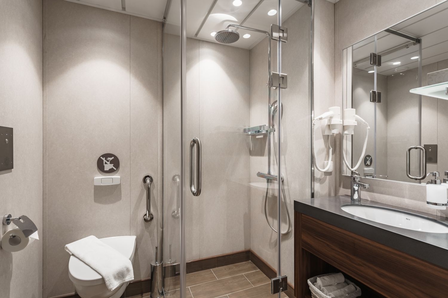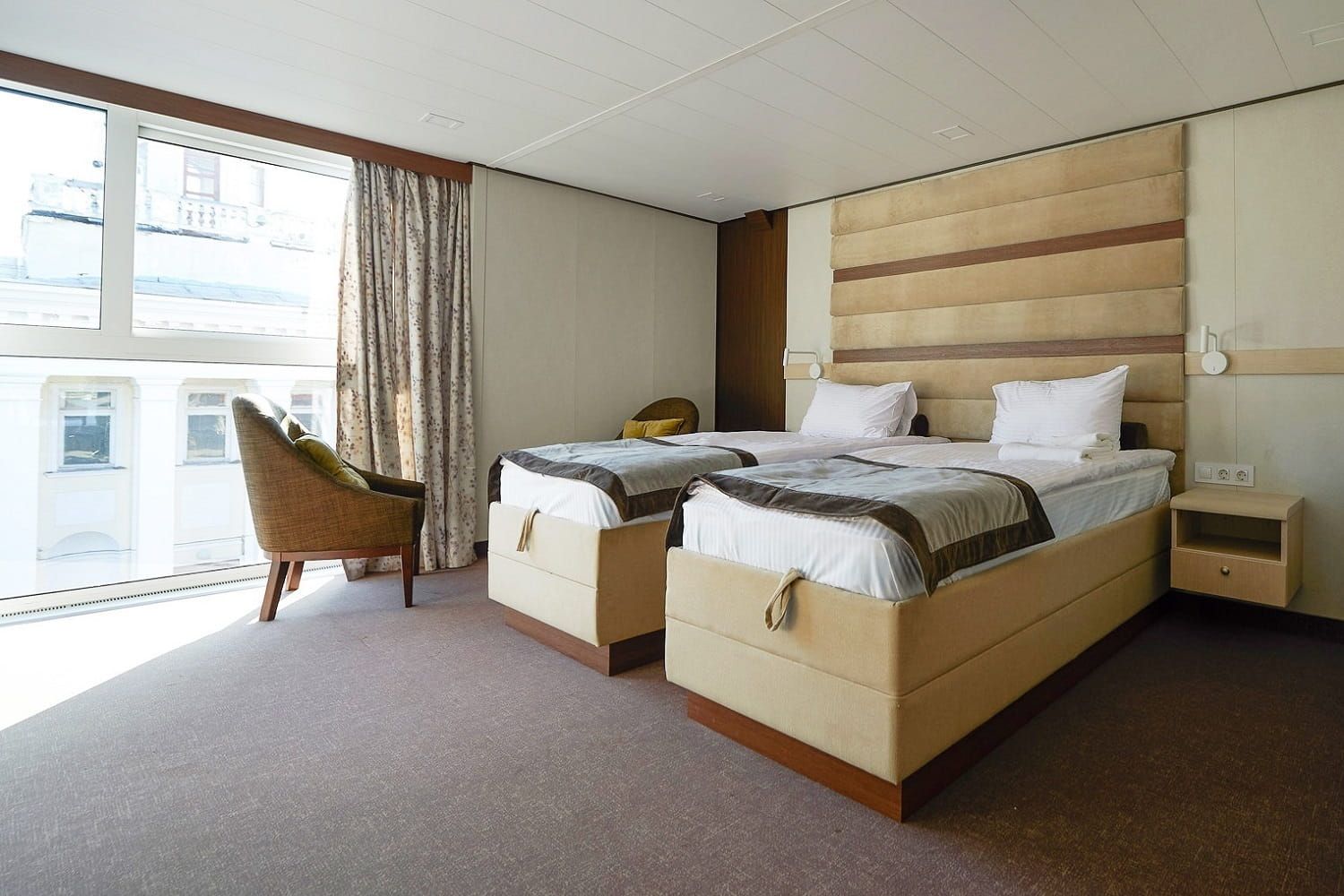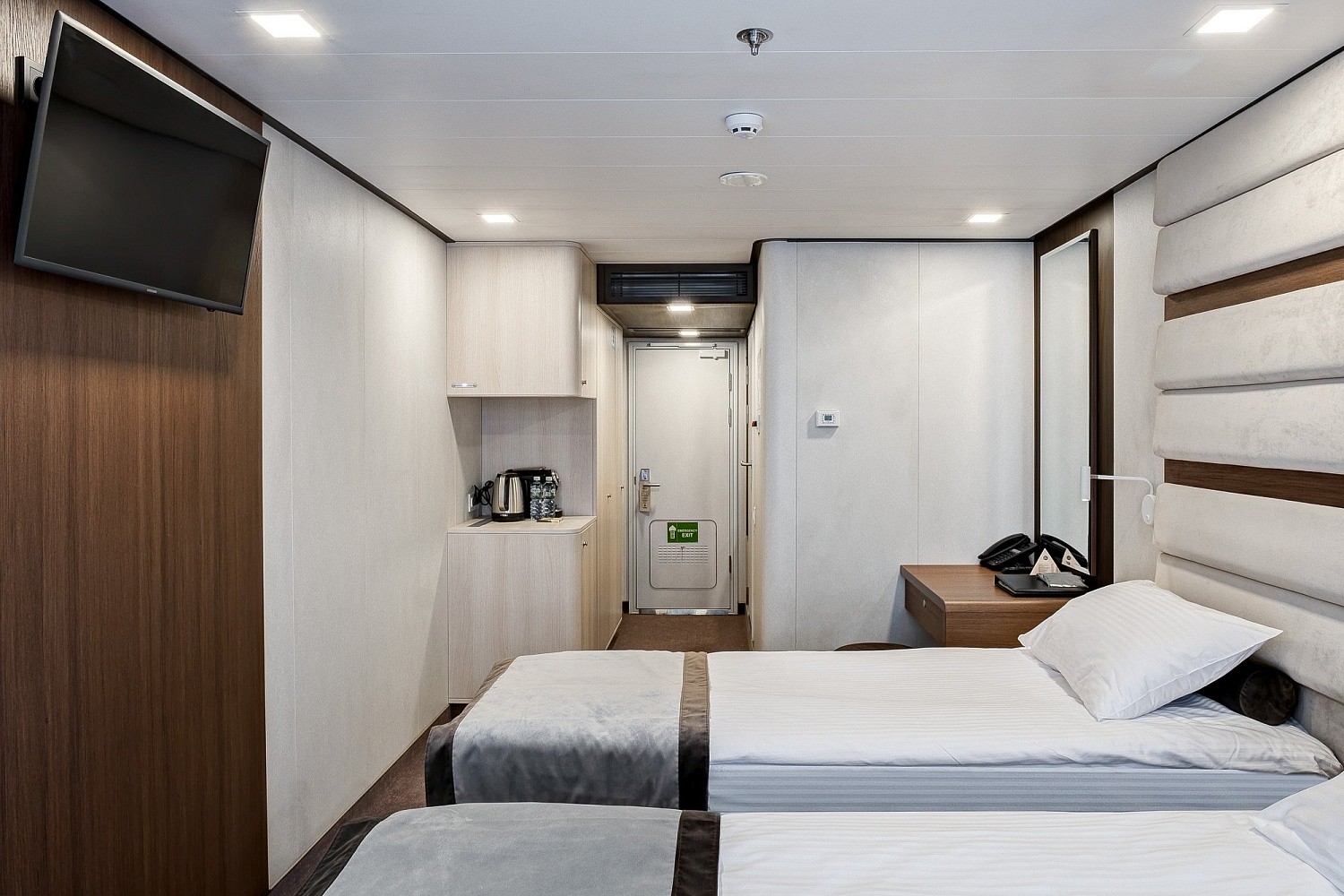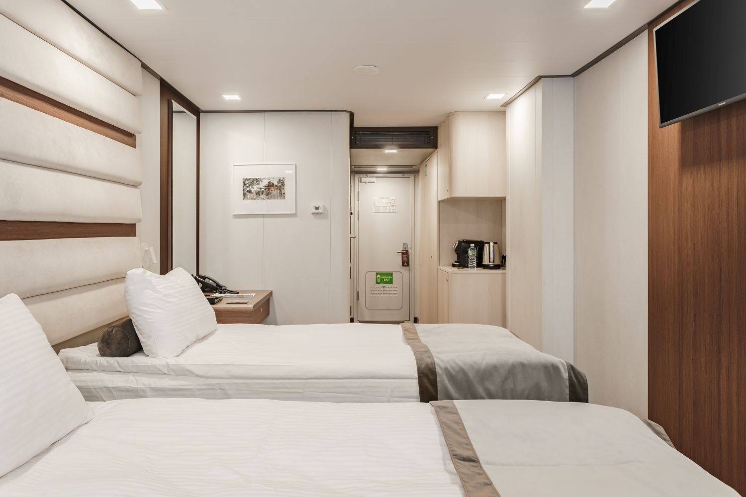 В каюте: две односпальные кровати (сдвигаются), панорамное окно, спутниковое ТВ, шкаф для одежды, холодильник, кондиционер, розетки 220V, телефон, радио, фен, капсульная кофемашина, электрочайник, сейф, душ, санузел. Площадь — 19 кв.м.