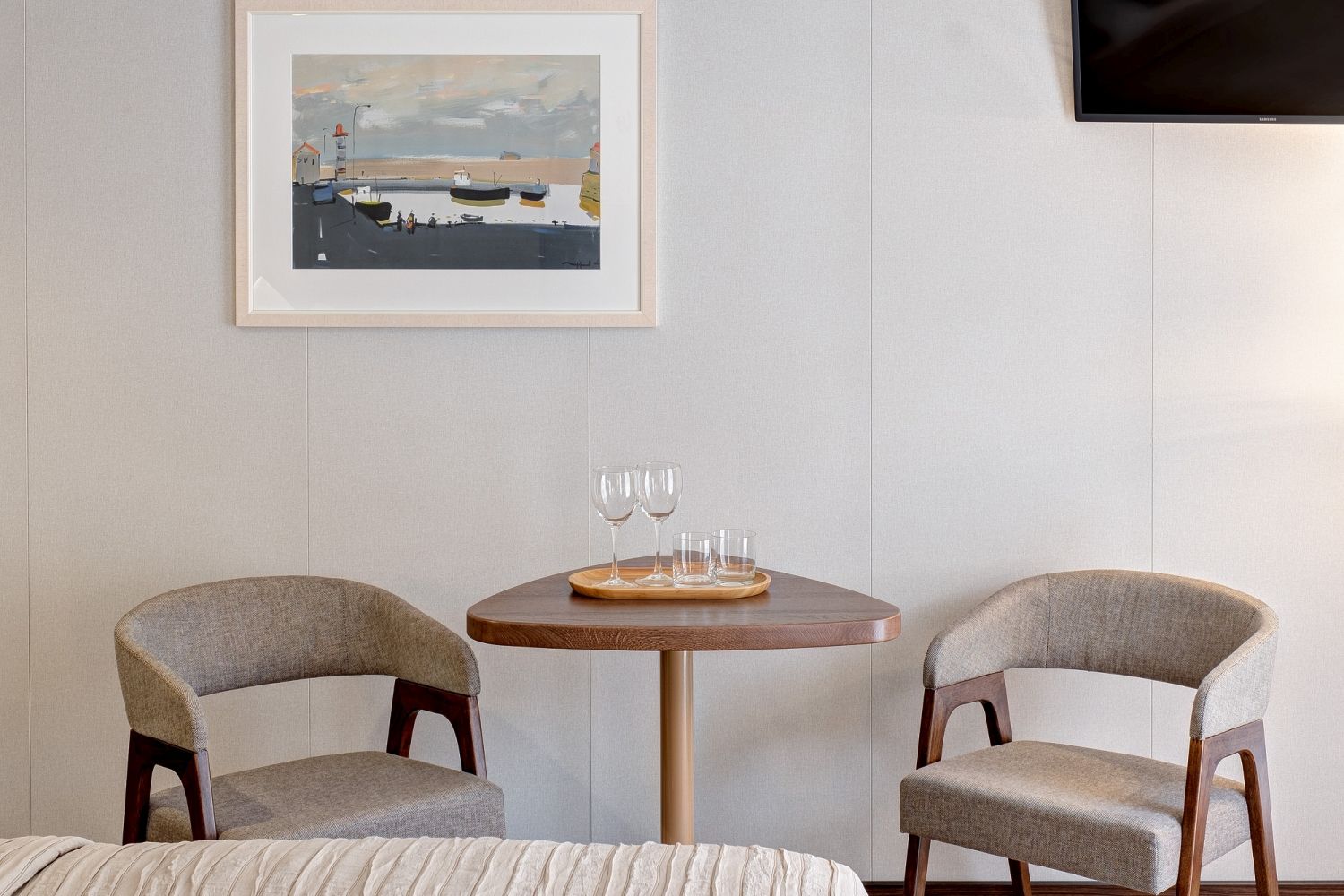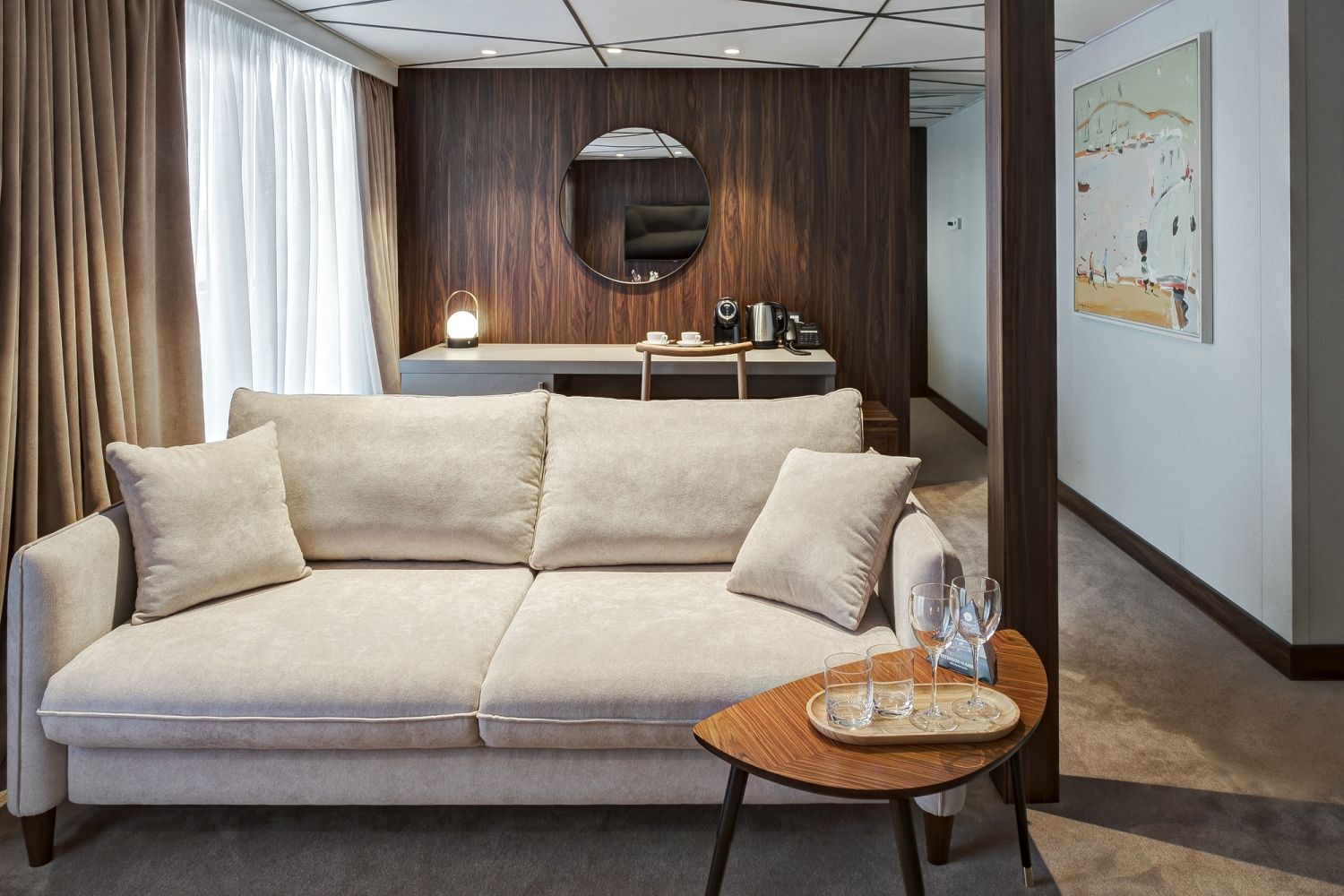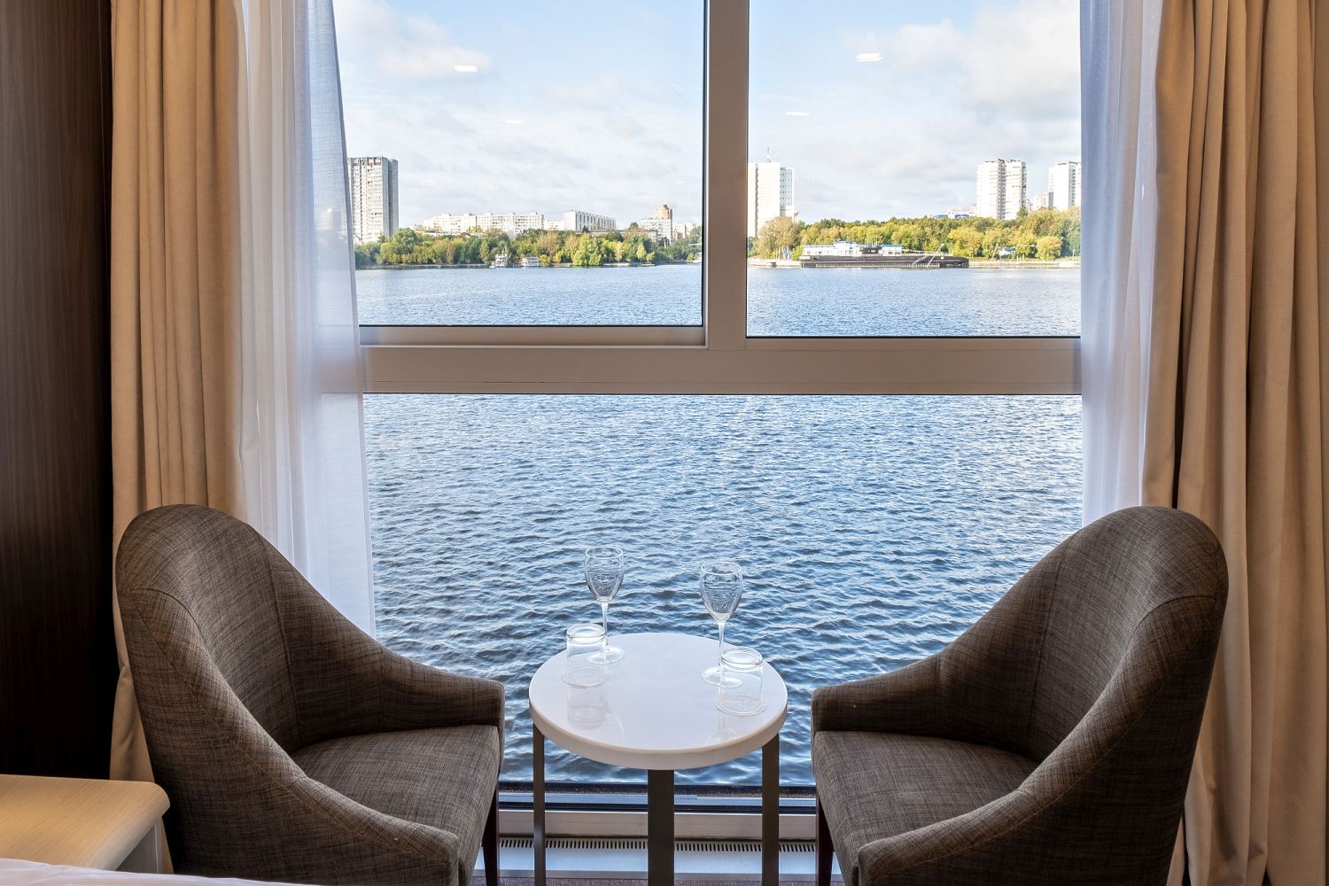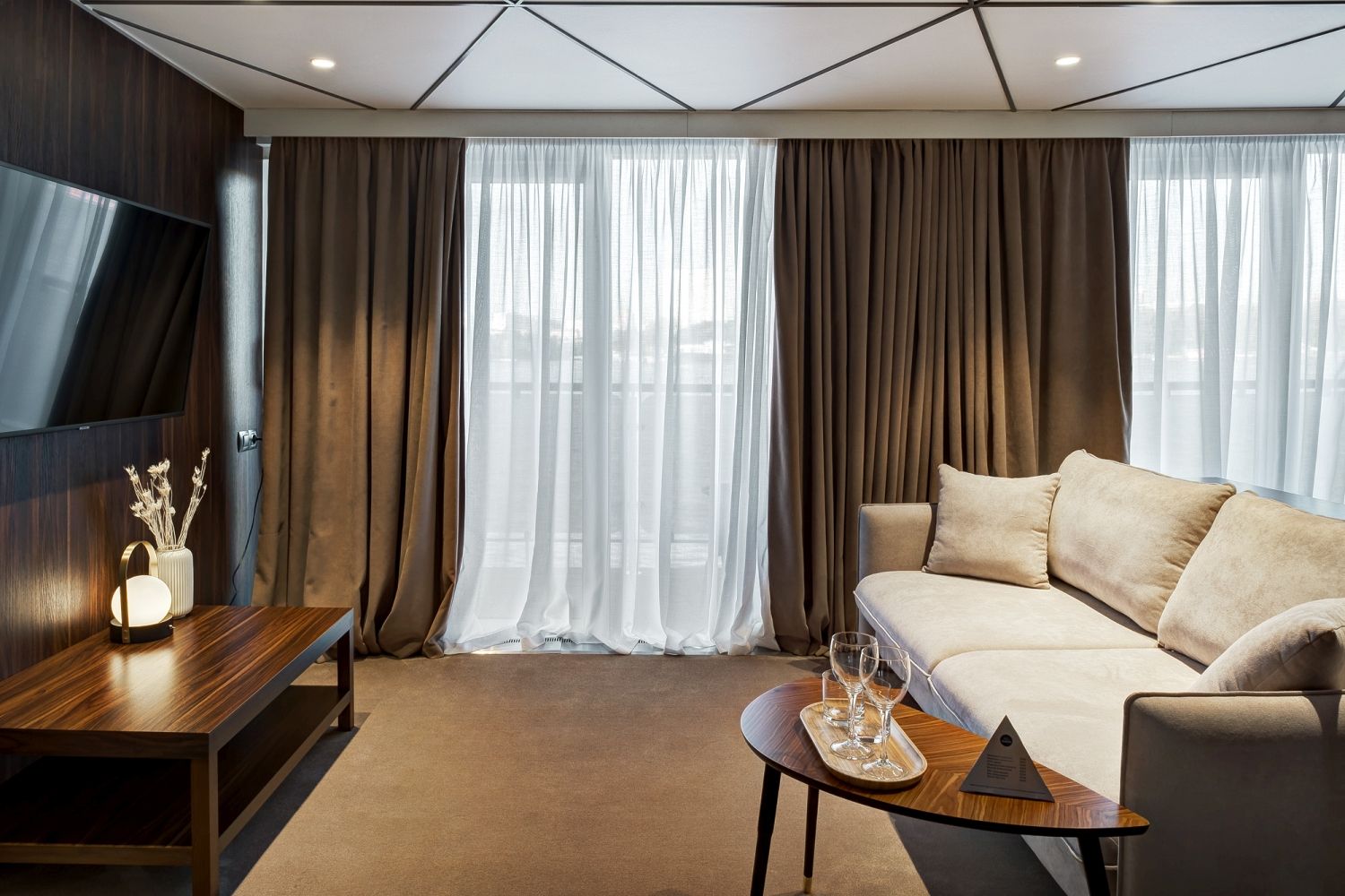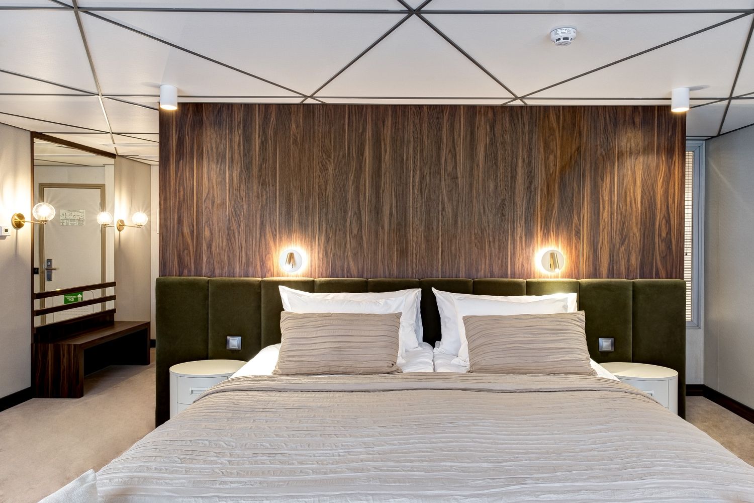 В каюте: две односпальные кровати (сдвигаются), панорамное окно, спутниковое ТВ, шкаф для одежды, холодильник, кондиционер, розетки 220V, телефон, радио, фен, капсульная кофемашина, электрочайник, сейф, душ, санузел. Площадь — 19 кв.м.