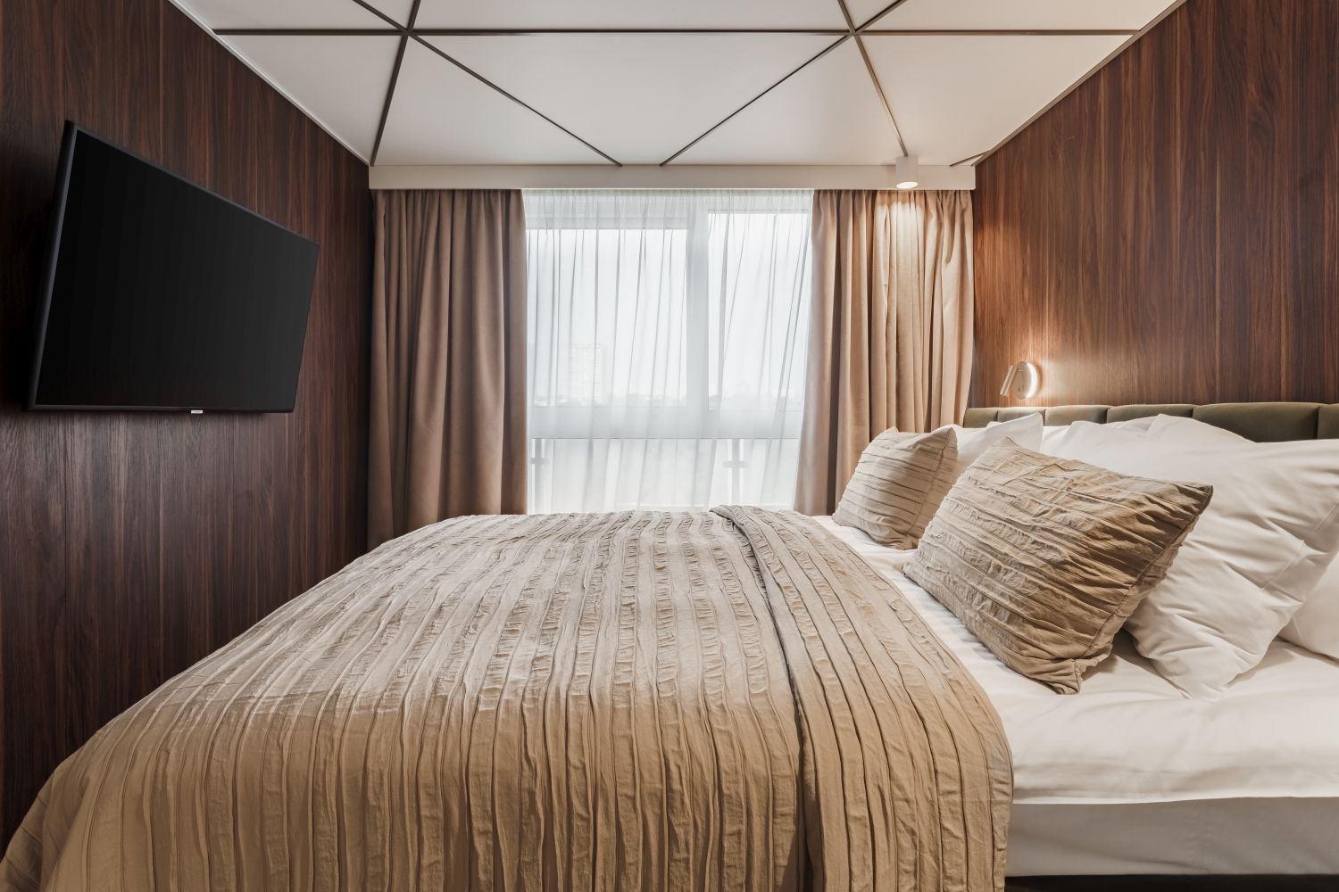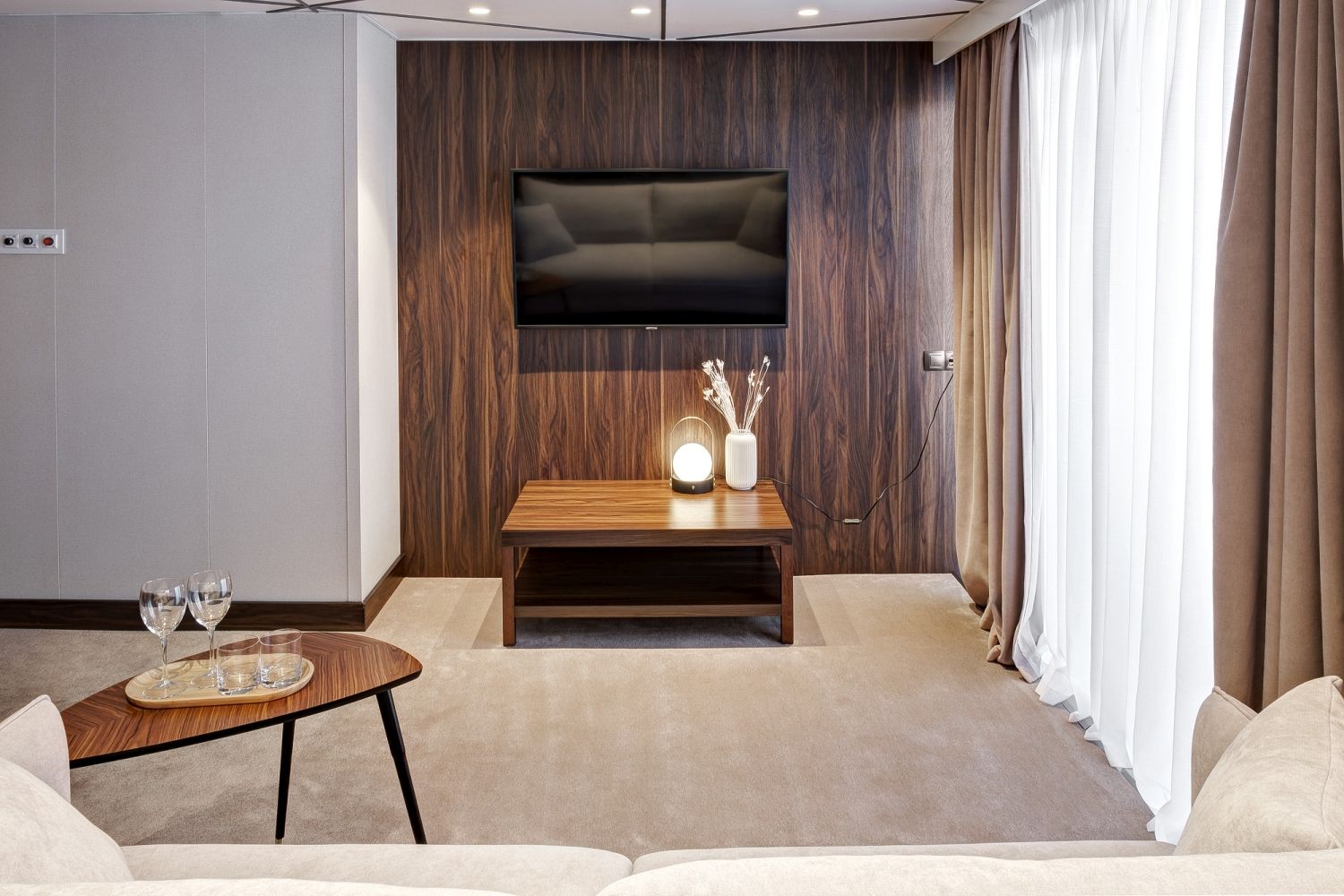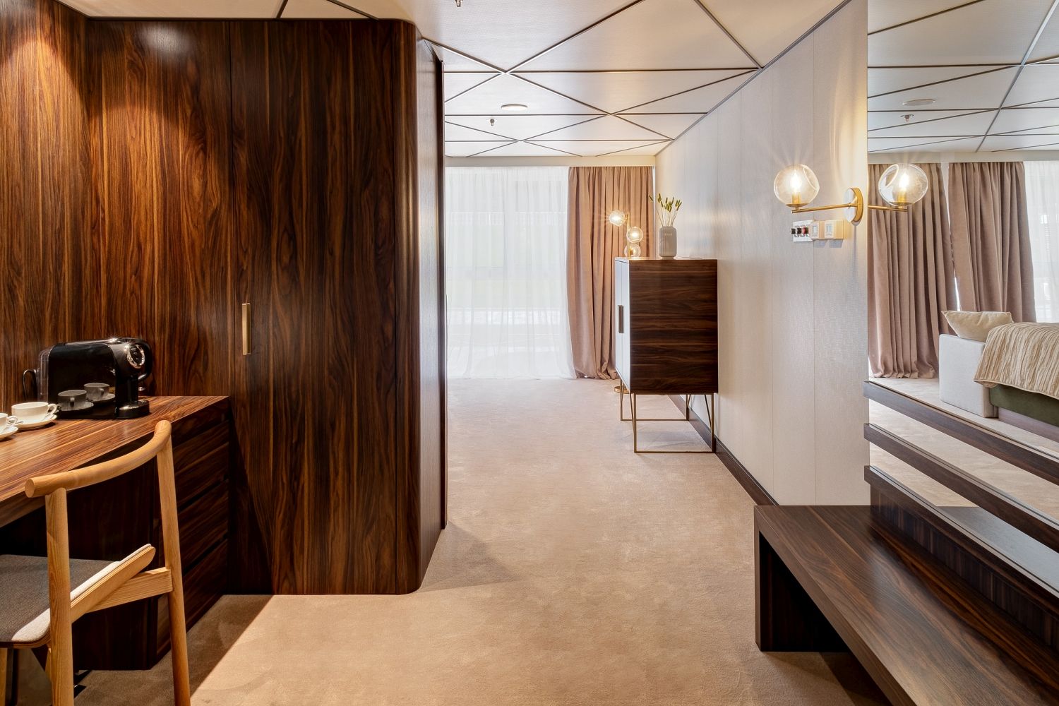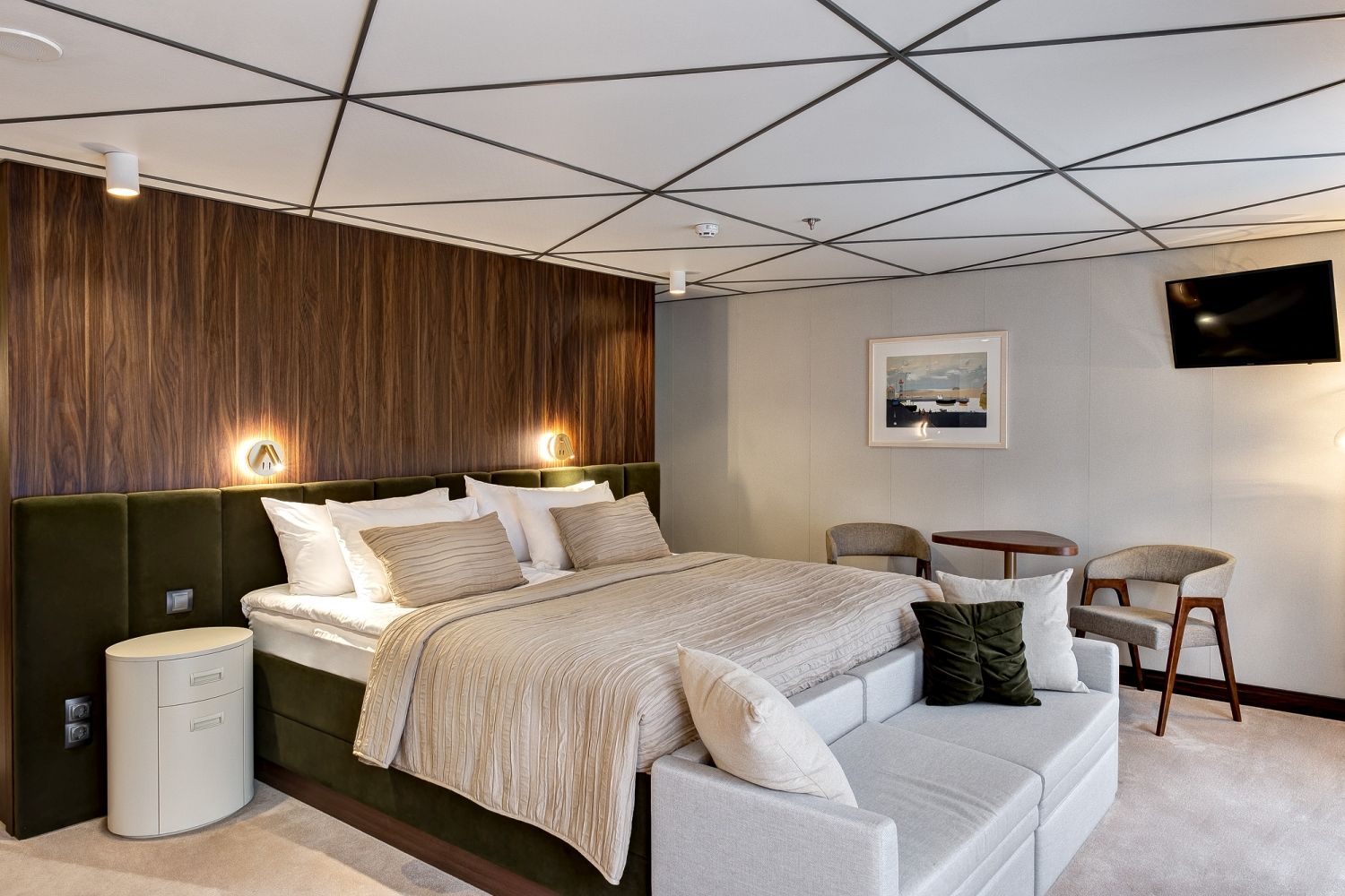 В каюте: двуспальная кровать (раздвигается), диван, панорамные окна, спутниковое ТВ, шкаф для одежды, холодильник, кондиционер, розетки 220V, телефон, радио, фен, капсульная кофемашина, электрочайник, сейф, ванна или душ, санузел. Площадь — до 37 м2.