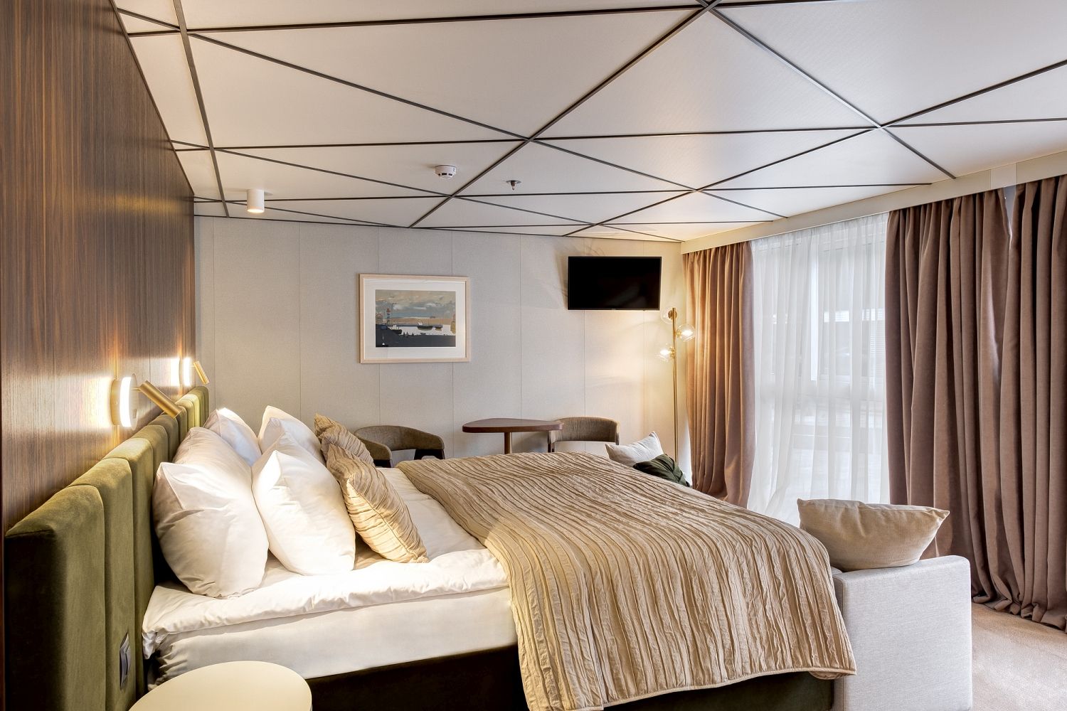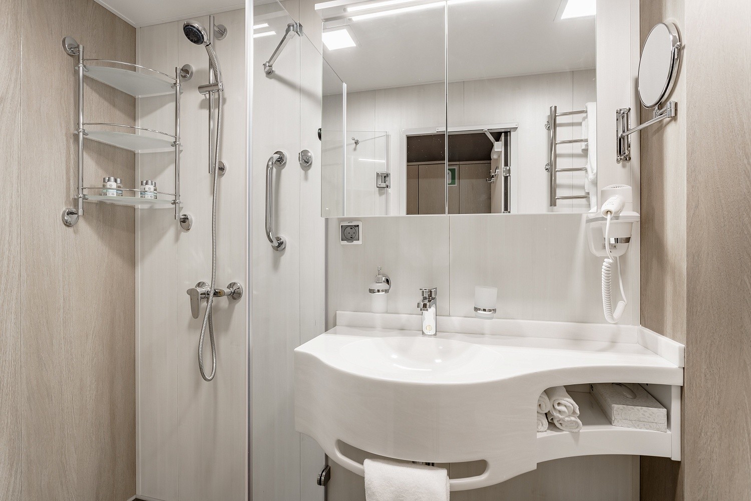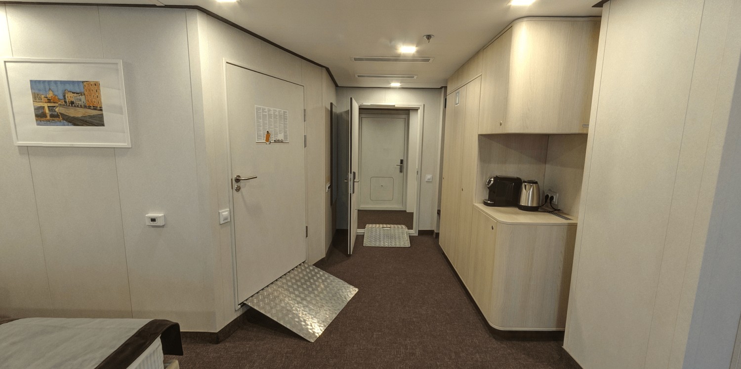 В каюте: две односпальные кровати (сдвигаются), панорамное окно, спутниковое ТВ, шкаф для одежды, холодильник, кондиционер, розетки 220V, телефон, радио, фен, сейф, капсульная кофемашина, электрочайник, душ, санузел. Площадь — 19 кв.м.