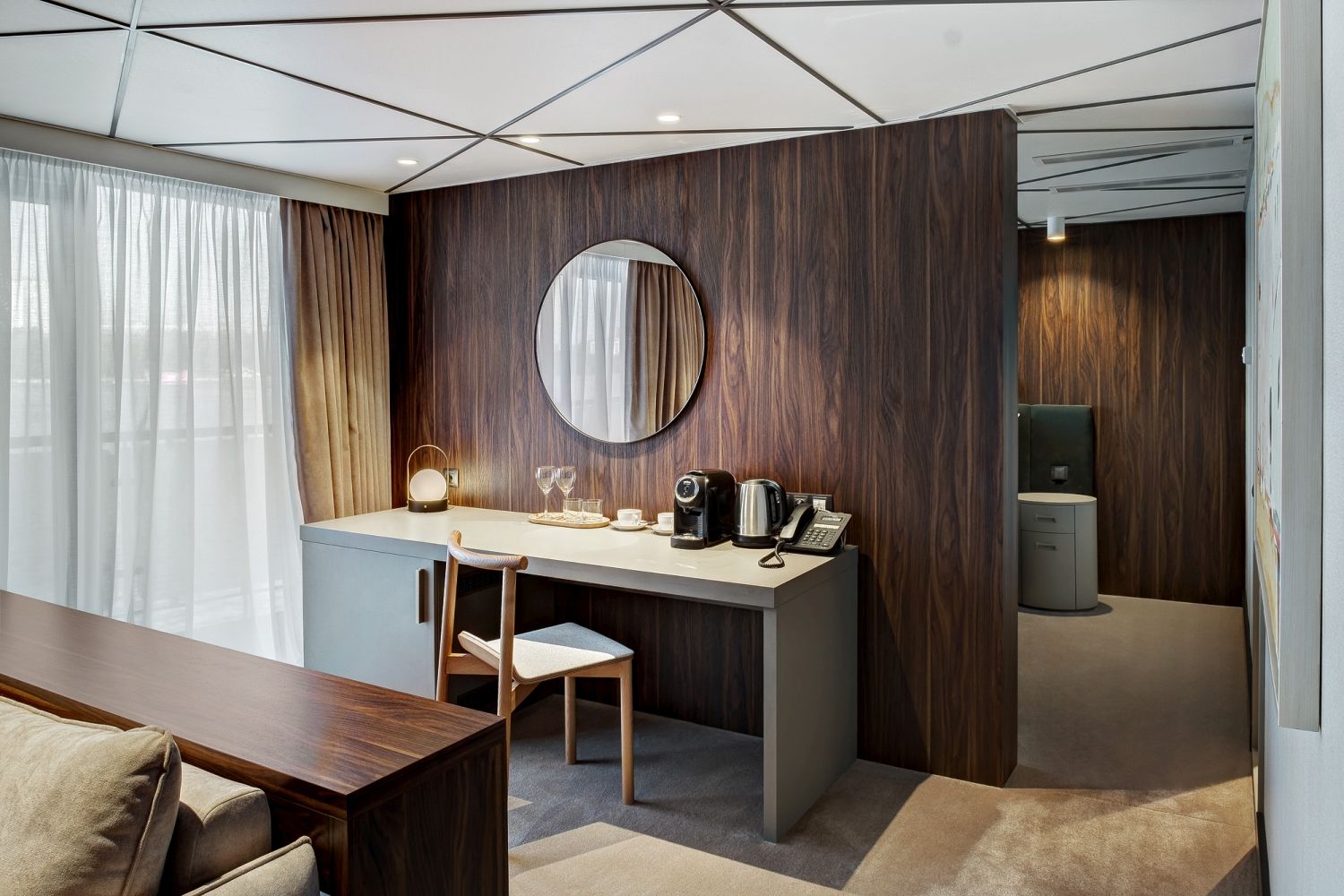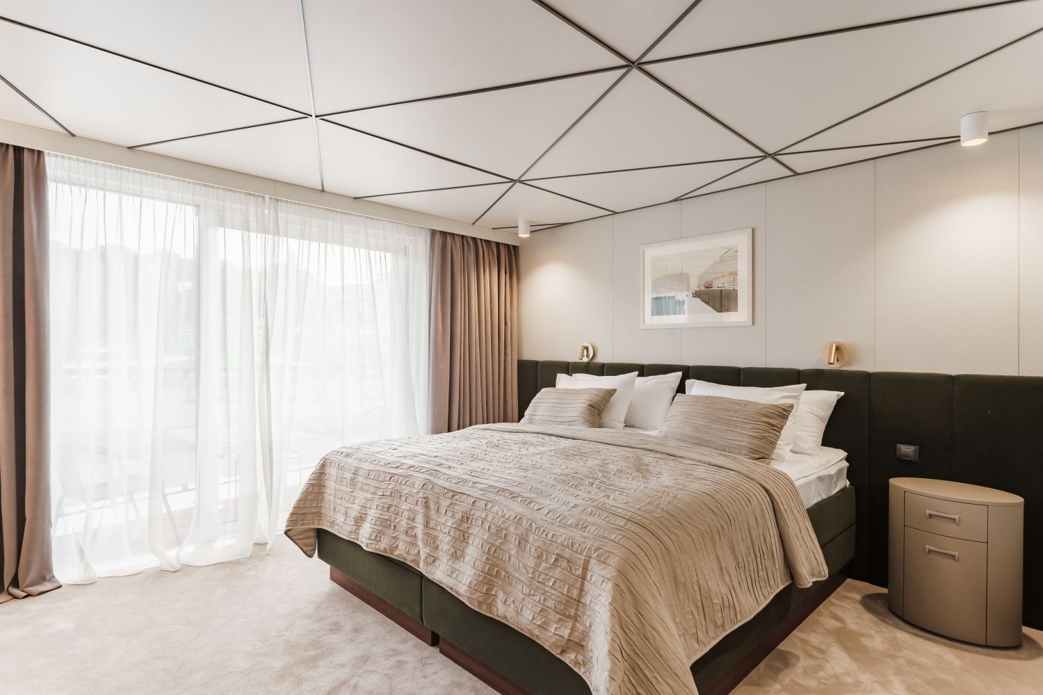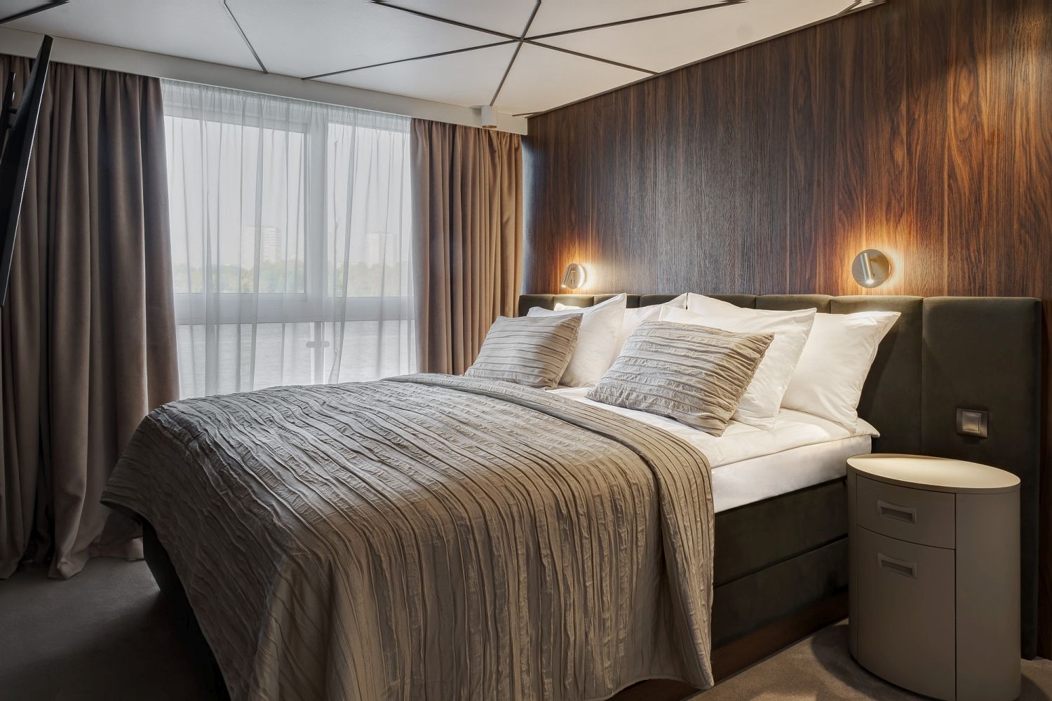 В каюте: две односпальные кровати (сдвигаются), панорамное окно, спутниковое ТВ, шкаф для одежды, холодильник, кондиционер, розетки 220V, телефон, радио, фен, сейф, капсульная кофемашина, электрочайник, душ, санузел. Площадь — 19 кв.м.