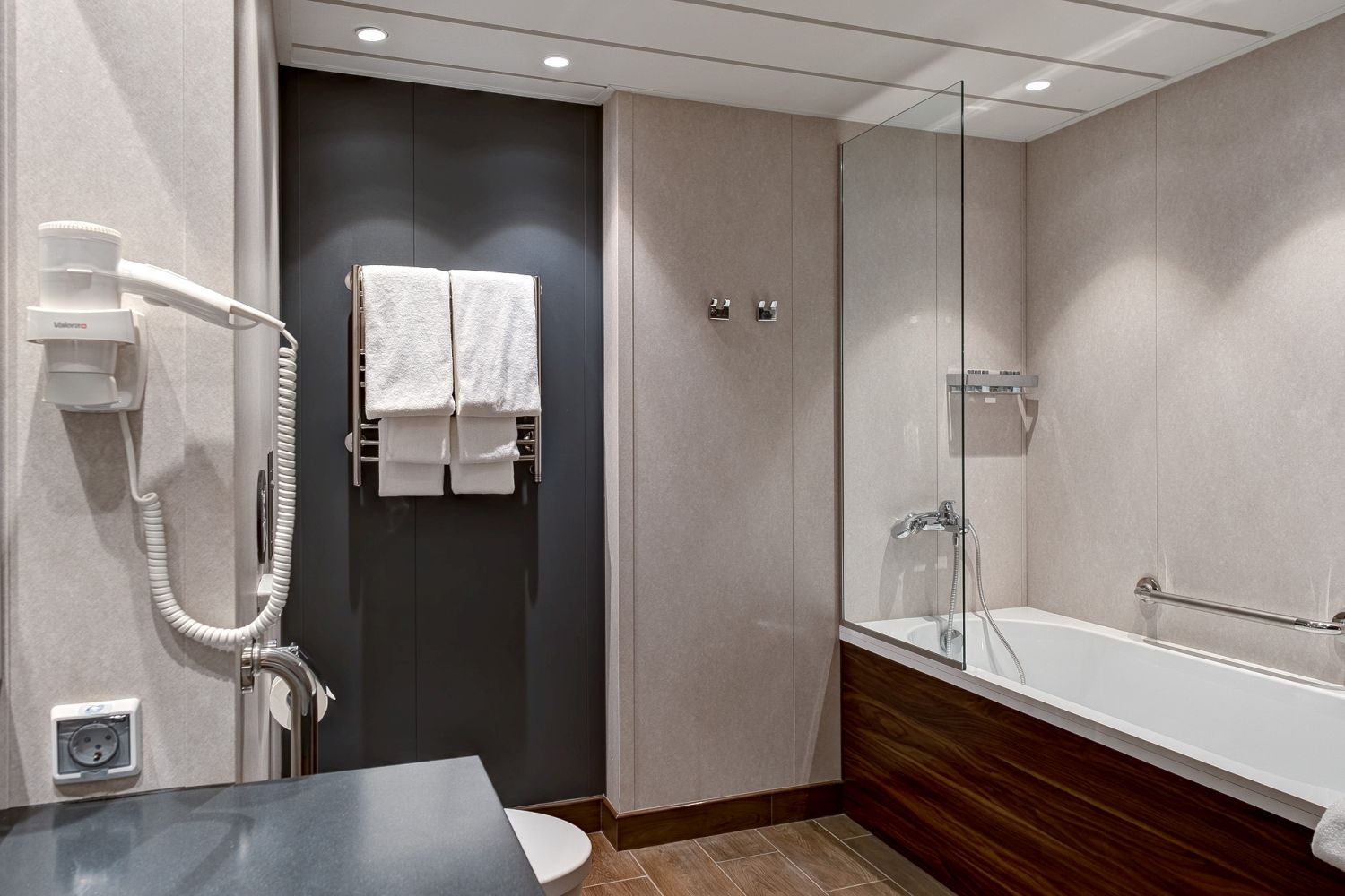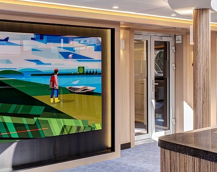 В каюте: две односпальные кровати (сдвигаются), панорамное окно, спутниковое ТВ, шкаф для одежды, холодильник, кондиционер, розетки 220V, телефон, радио, фен, капсульная кофемашина, электрочайник, сейф, душ, санузел. Площадь — 19 м2.