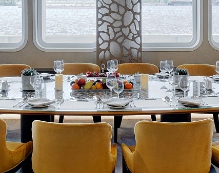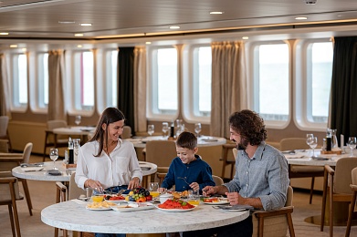 - Обед — заказная система питания (выбор блюд со 2-го дня круиза) с элементами шведского стола (десерт, фрукты, морсы), фиксированная рассадка. Включённые напитки (без ограничения): вода, чай, кофе, домашний морс;