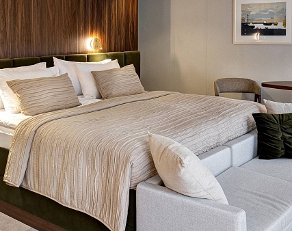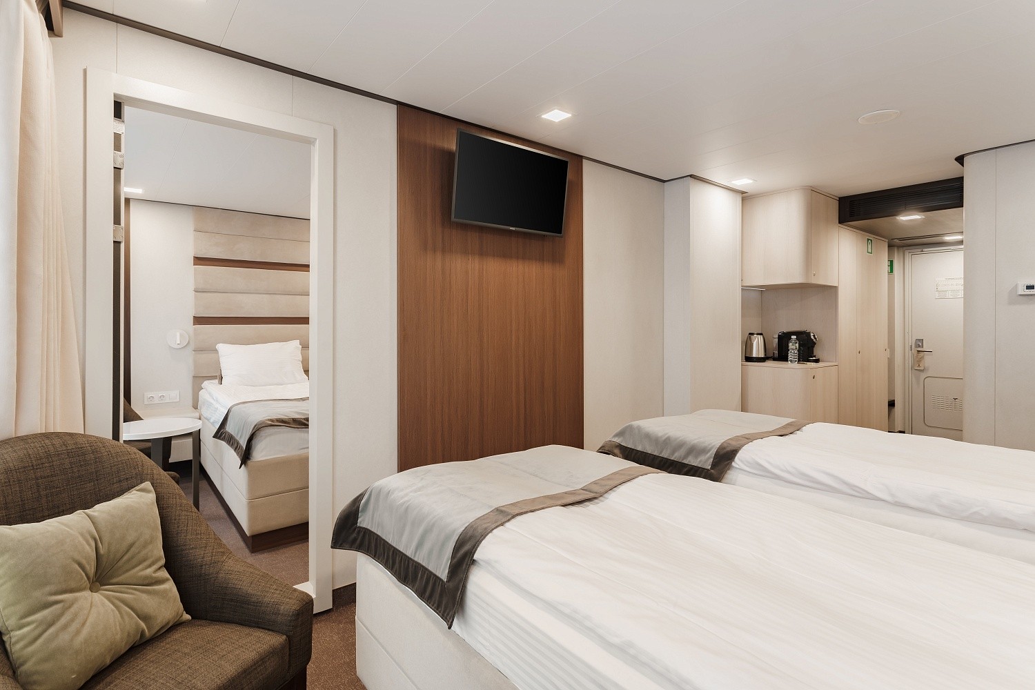 Данные каюты оборудованы межкомнатной звукоизоляционной дверью, оснащены качественной функциональной мебелью и современной бытовой техникой. Это идеальное решение - объединение пространства для большой семьи, ценящей комфорт. Площадь кают после объединения — 38 м2.