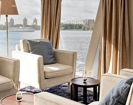 В каюте: двуспальная кровать (раздвигается), диван, панорамные окна, балкон, спутниковое ТВ, шкаф для одежды, холодильник, кондиционер, розетки 220V, телефон, радио, фен, капсульная кофемашина, электрочайник, cейф, душ, ванна, санузел. Площадь — 46 м2. (площадь балкона — 10 м2.)