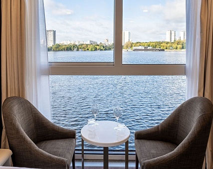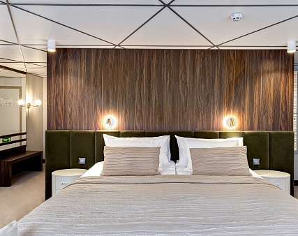 В каюте: двуспальная кровать (раздвигается), панорамные окна, спутниковое ТВ, шкаф для одежды, холодильник, кондиционер, розетки 220V, телефон, радио, фен, капсульная кофемашина, электрочайник, сейф, душ, санузел. Площадь — 24 м2. (площадь балкона Люкса №258 — 6 м2, Люкса №259 — 4 м2.)