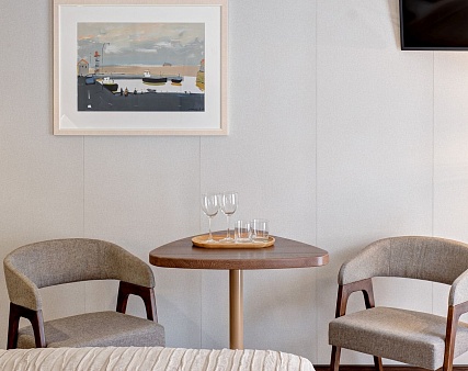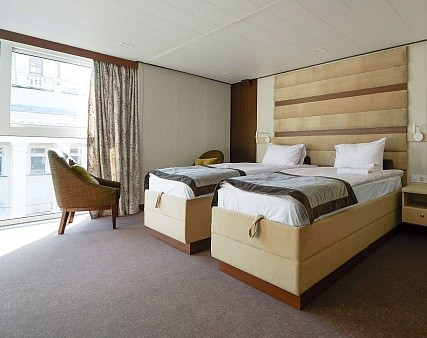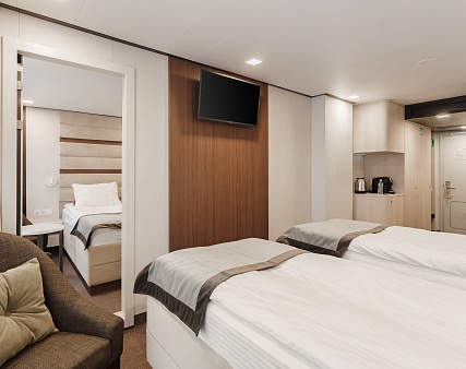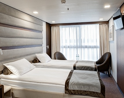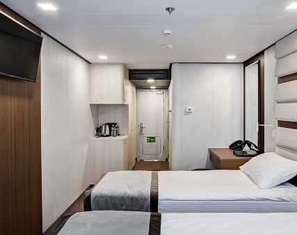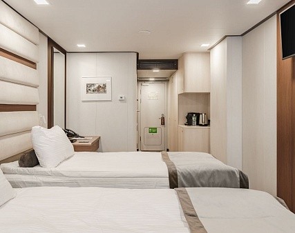В каюте: две односпальные кровати (сдвигаются), панорамное окно, спутниковое ТВ, шкаф для одежды, холодильник, кондиционер, розетки 220V, телефон, радио, фен, капсульная кофемашина, электрочайник, сейф, душ, санузел. Площадь — 19 кв.м.