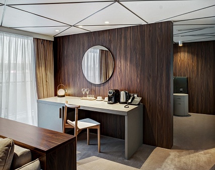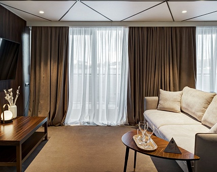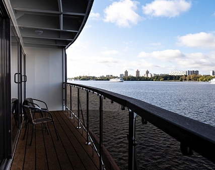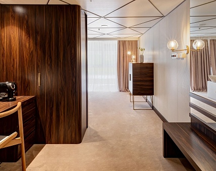 В каюте: двуспальная кровать (раздвигается), диван, панорамные окна, балкон, спутниковое ТВ, шкаф для одежды, холодильник, кондиционер, розетки 220V, телефон, радио, фен, капсульная кофемашина, электрочайник, cейф, душ, ванна, санузел. Площадь — 46 м2. (площадь балкона — 10 м2.)