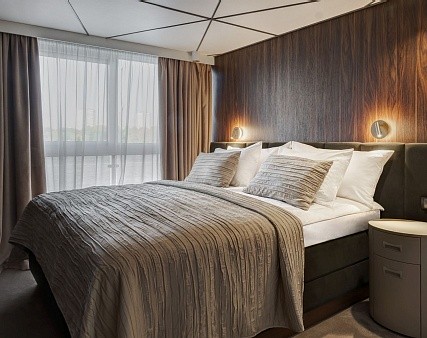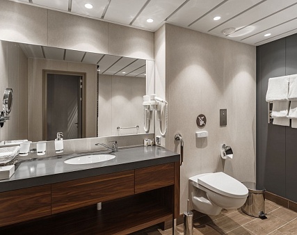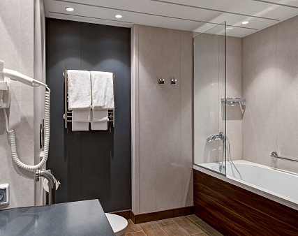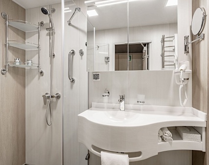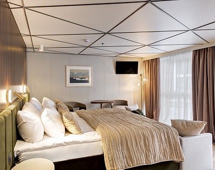 В каюте: две односпальные кровати (сдвигаются), панорамное окно, спутниковое ТВ, шкаф для одежды, холодильник, кондиционер, розетки 220V, телефон, радио, фен, сейф, капсульная кофемашина, электрочайник, душ, санузел. Площадь — 19 кв.м.