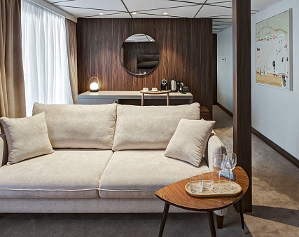 В каюте: двуспальная кровать (раздвигается), диван, панорамные окна, спутниковое ТВ, шкаф для одежды, холодильник, кондиционер, розетки 220V, телефон, радио, фен, капсульная кофемашина, электрочайник, сейф, ванна или душ, санузел. Площадь — до 37 м2.