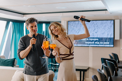 - Ужин — заказная система питания (выбор блюд со 2-го дня круиза), фиксированная рассадка. Включённые напитки (без ограничения): вода, чай, кофе, домашний морс. На выбор: вино красное / белое / игристое (1 бокал, 125 мл) / водка (1 рюмка 50 мл) / пиво (1 бокал, 300 мл).