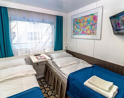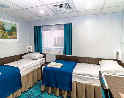 В каюте: три спальных места (два внизу, одно — вторым ярусом), шкаф для одежды, трюмо, радио, телевизор, фен, холодильник, сейф, два иллюминатора, электророзетка на 220V.