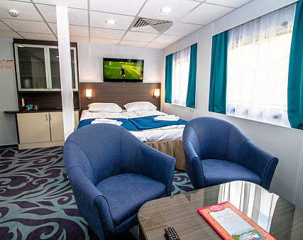 В каюте: кровать, шкаф для одежды, трюмо, телевизор, холодильник, сейф, радио, фен, одно обзорное окно, электророзетка на 220V. Двуспальная кровать размером 160х200 см, площадь каюты 15,5 м2