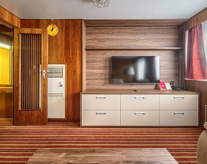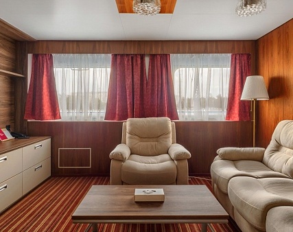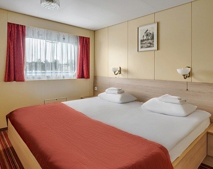 В каюте: два спальных места, шкаф для одежды, радио, душ, санузел, кондиционер, обзорное окно, электророзетка на 220V.