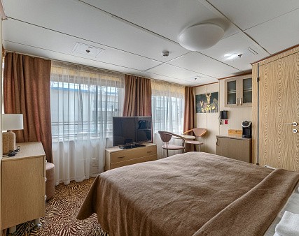 В каюте: две кровати, кровати не сдвигаются, шкаф для одежды, стол-бюро, кресло, телевизор, холодильник, радио, сейф, фен, два обзорных окна, электророзетка на 220V.
