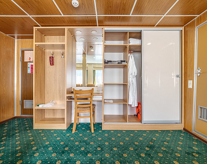 Просторная каюта с современным интерьером, четыре отдельных спальных места, шкаф для одежды, журнальный столик, телевизор c DVD, душ, санузел, холодильник, радио, два обзорных окна, электророзетка на 220V, фен.