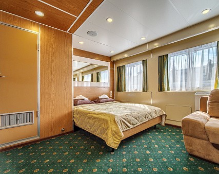 Просторная каюта с современным интерьером, мягкая мебель — диван, два кресла, двуспальная кровать, шкаф для одежды, телевизор c DVD, холодильник, радио, три обзорных окна, электророзетка на 220V, фен, кондиционер.