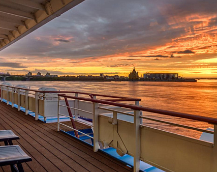 - Ужин — заказная система питания (выбор блюд со 2-го дня круиза). Включённые напитки (без ограничения): вода, чай, кофе, кисломолочный напиток (1 стакан 200 мл на ужин по запросу гостя). На выбор: вино красное / белое / игристое (1 бокал, 125 мл) / водка (1 рюмка, 50 мл) / пиво (1 бокал, 300 мл), домашний морс (1 бокал, 200 мл);