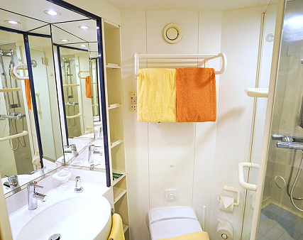 В каюте: кровать и диван (расположены буквой Г), кондиционер, гардероб, телевизор, телефон, фен, сейф, халаты, увлажнитель воздуха. Ванная комната с душем и туалетом.