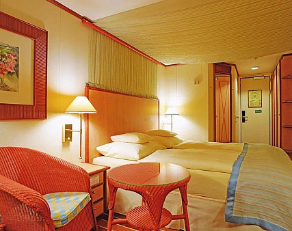 В каюте: окно с загороженным видом (шлюпкой или конструкцией лайнера), две односпальные кровати, кондиционер, гардероб, телевизор, телефон, фен, сейф, халаты, увлажнитель воздуха. Ванная комната с душем и туалетом.