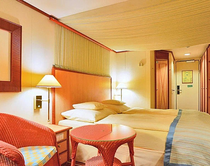 В каюте: окно с ограниченным видом (шлюпкой или конструкцией лайнера), одна двуспальная кровать (на 7 палубе) или две односпальные кровати (на 6 палубе), кондиционер, гардероб, телевизор, телефон, фен, сейф, халаты, увлажнитель воздуха. Ванная комната с душем и туалетом.