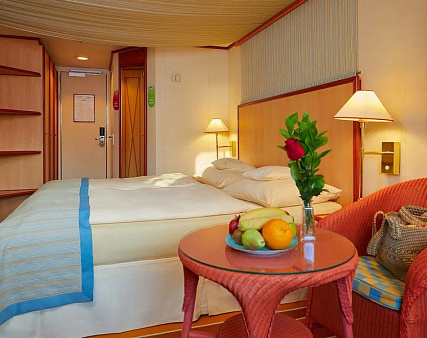 В каюте: окно с ограниченным видом (шлюпкой или конструкцией лайнера), одна двуспальная кровать, диван, кондиционер, гардероб, телевизор, телефон, фен, сейф, халаты, увлажнитель воздуха. Ванная комната с душем и туалетом.