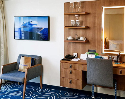 В каюте: балкон, одна двуспальная кровать, диван, холодильник, кондиционер, гардероб, телевизор, телефон, фен, сейф, халаты, увлажнитель воздуха, кофемашина, чайник. Ванная комната с ванной и туалетом.