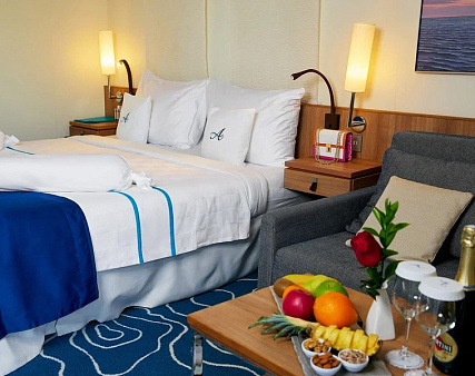 В каюте: Кровать и диван, ванная комната (раковина, душ, туалет), сейф, гардероб, диван, фен, телефон, телевизор, кондиционер, банные халаты, увлажнитель воздуха.