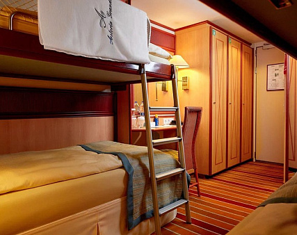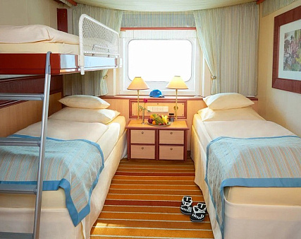 В каюте: окно с ограниченным видом (шлюпкой или конструкцией лайнера), две односпальные кровати, верхняя откидная полка-пульман, кондиционер, гардероб, телевизор, телефон, фен, сейф, халаты, увлажнитель воздуха. Ванная комната с душем и туалетом.
