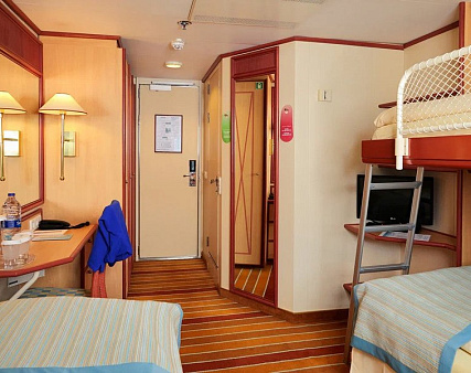 В каюте: окно с ограниченным видом (шлюпкой или конструкцией лайнера), две односпальные кровати, две верхние откидные полки-пульманы, кондиционер, гардероб, телевизор, телефон, фен, сейф, халаты, увлажнитель воздуха. Ванная комната с душем и туалетом.