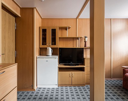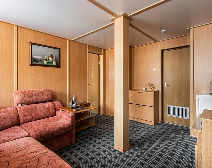 Двухкомнатный на средней палубе. Номер каюты: 119. Двухкомнатная каюта с удобствами (душ, санузел, кондиционер). Каюта рассчитана на размещение от двух до четырех человек. В гостиной: шкаф-стенка, диван, раскладывающийся на двоих, телевизор, холодильник, радио, фен, два обзорных окна, электророзетка на 220V. В спальне: два спальных места (одно над другим), зеркало.