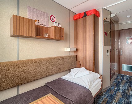 В каюте: одно спальное место, шкаф для одежды, радио, душ, санузел, кондиционер, обзорное окно, зеркало, электророзетка на 220V.
