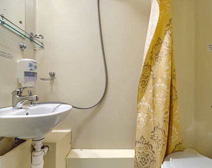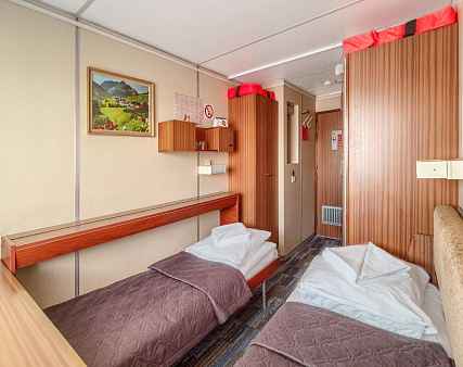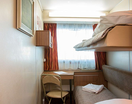 В каюте: три спальных места (два внизу, одно — вторым ярусом), шкаф для одежды, радио, зеркало, душ, санузел, кондиционер, обзорное окно, электророзетка на 220V.