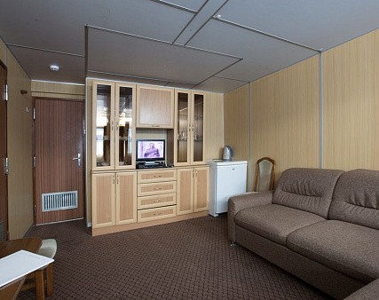 Двухкомнатный на средней палубе. Номер каюты: 119. Двухкомнатная каюта с удобствами (душ, санузел, кондиционер). Каюта рассчитана на размещение от двух до четырех человек. В гостиной: шкаф-стенка, диван, раскладывающийся на двоих, телевизор, холодильник, радио, фен, два обзорных окна, электророзетка на 220V. В спальне: два спальных места (одно над другим), зеркало.