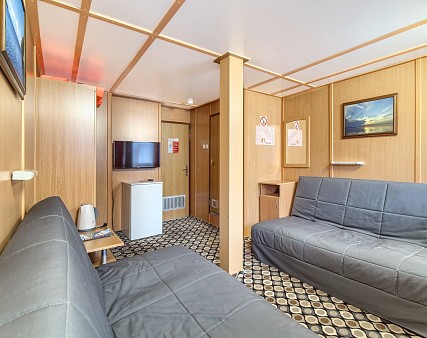 В каюте: три спальных места (два внизу, одно — вторым ярусом), шкаф для одежды, радио, зеркало, душ, санузел, кондиционер, обзорное окно, электророзетка на 220V.