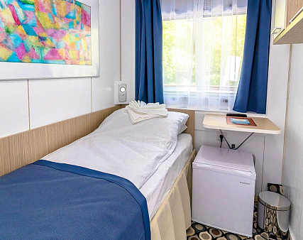 В каюте: двуспальная кровать, шкаф для одежды, трюмо, телевизор, холодильник, сейф, фен, радио, одно обзорное окно, электророзетка на 220V.