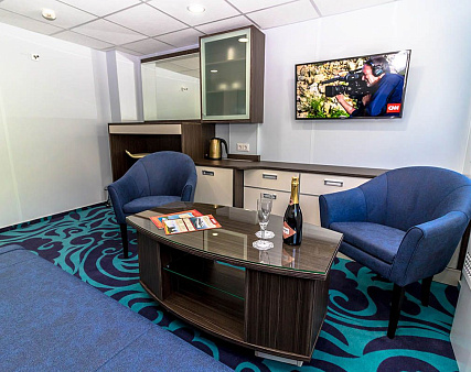 В каюте: три спальных места (два внизу, одно — вторым ярусом), шкаф для одежды, трюмо, радио, телевизор, холодильник, фен, сейф, обзорное окно, электророзетка на 220V.