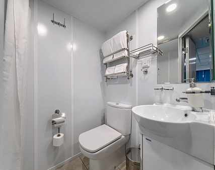 В каюте: одно спальное место, шкаф для одежды, радио, телевизор, холодильник, сейф, фен, душ, санузел, кондиционер, обзорное окно, электророзетка на 220V.