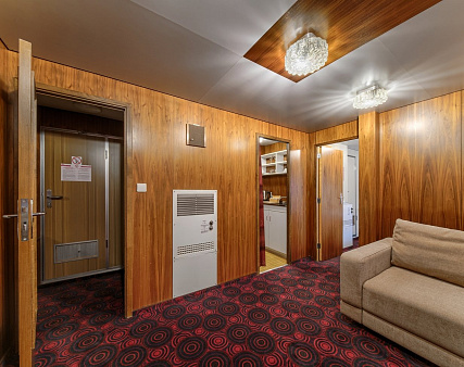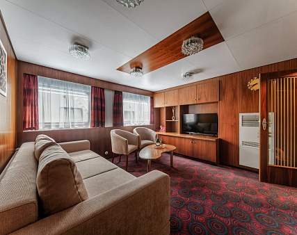 Площадь каюты 26,9 м2 (спальная комната - 9,7 м2, гостиная - 17,2 м2)